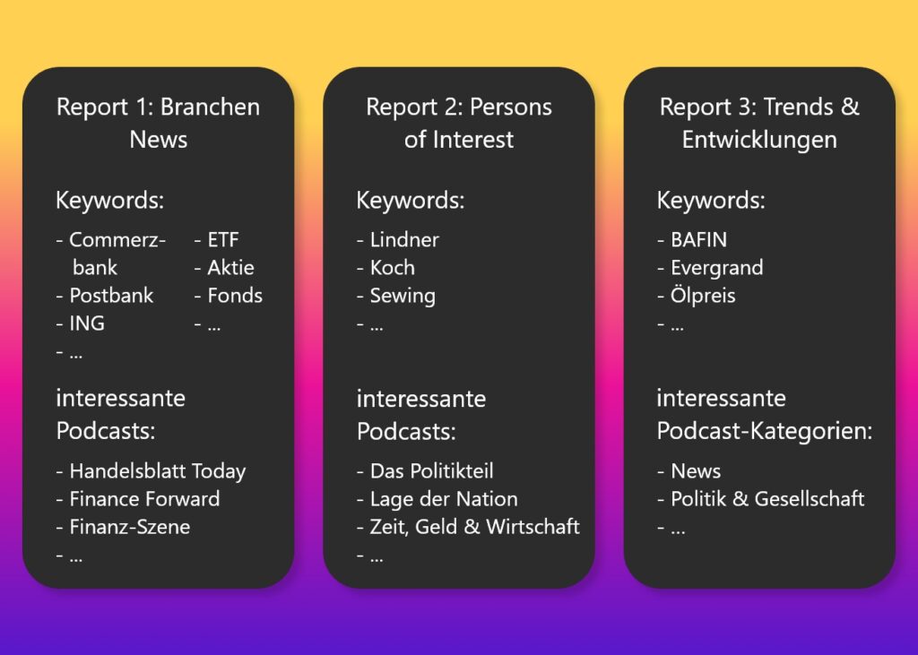 Brand Monitoring für den Bankensektor und insbesondere die Trenderkennung bei Anlage und Finanzierungthemen haben in Podcasts hohen Stellenwert. Banken unterliegen strengen regulatorischen Maßgaben und insbesondere in Zeiten von Skandalen und Inflation herrscht im Bankensektor und Finanzwesen reger Austausch, auch in Podcasts. Ob es um journalistische Diskussionen oder um Statements von Entscheidern aus der Bankenbranche geht – es ist schwer, im täglichen Podcast-Rauschen den Überblick zu behalten.