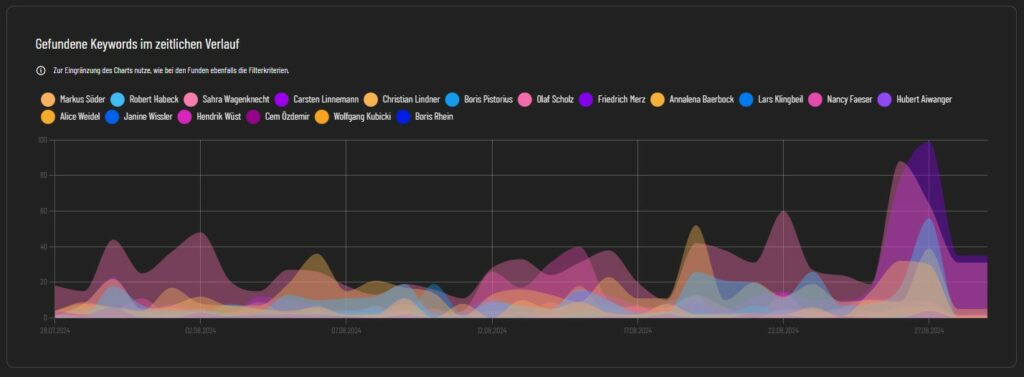 Thematisch dominieren Debatten um Migration (28% aller Themenerwähnungen), Demokratie (22%) und wirtschaftliche Zukunftsfähigkeit (18%). Der Anschlag in Solingen und die darauf folgenden Asylrechtsverschärfungen der Bundesregierung führten zu einem 40%igen Anstieg der Diskussionen über Migrationspolitik in der letzten Woche vor der Wahl.